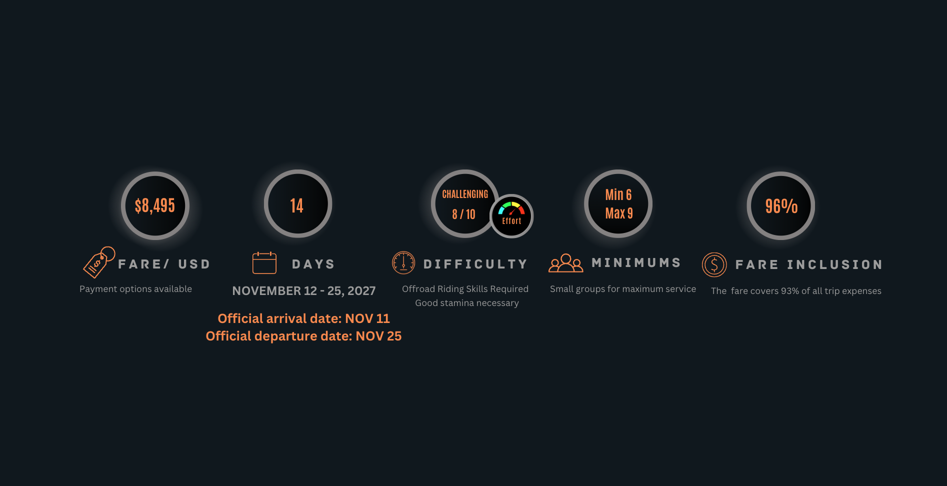 A true expedition of this type requires extensive planning and alignment of resources, all of which will fall within the trip fare. That includes; all accommodations within the trip dates, including the arrival day, meals, motorcycles, fuel, permits, and all of our extensive guide services. You won't reach for your wallet for two weeks.